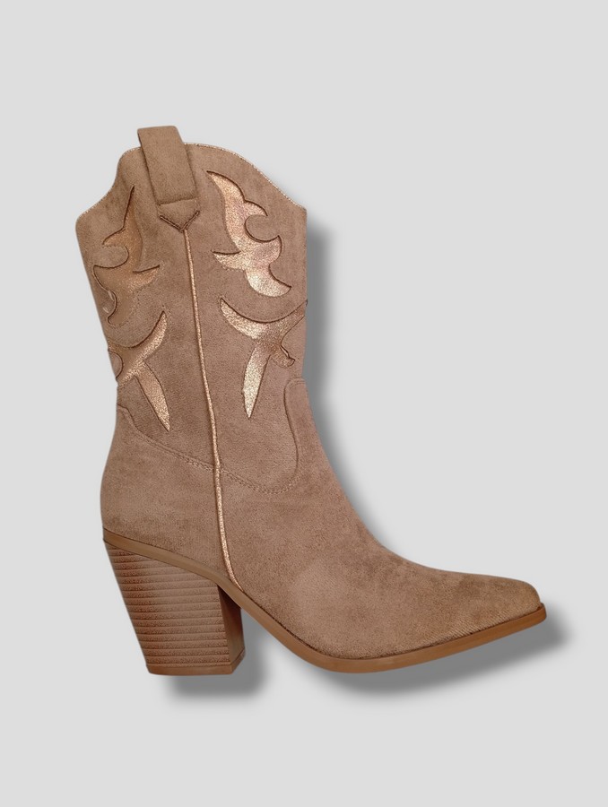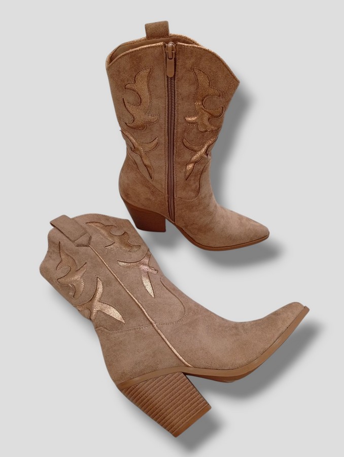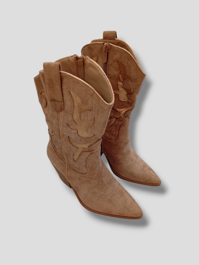 Bota campera. En tejido tipo antelina. Con cierre de cremallera en un lateral. Terminación en punta. Detalles en dorado. Con forro por dentro. Tacón de 7 cm.