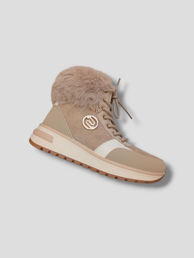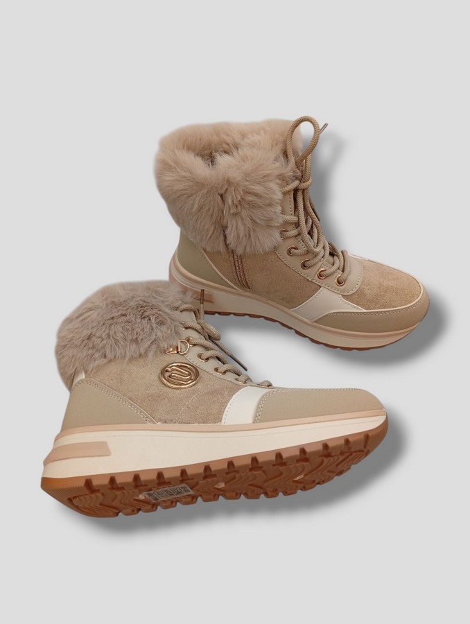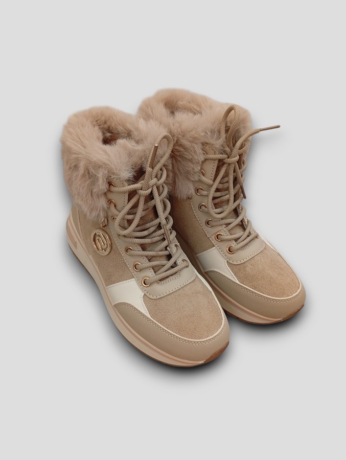 Botín con pelo. En tejido tipo antelina y polipiel. Con cierre de cremallera en un lateral y cordón en la parte central. Con pelo por dentro. Suela ancha.