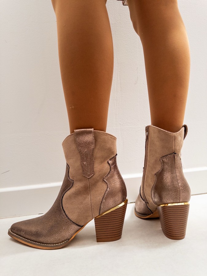 Botín taupe. Combinado con dorado envejecido. Cierre de cremallera en un lateral. Tacón de 6,5 cm con detalle dorado.