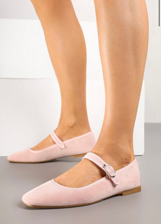 Francesitas. En tejido tipo terciopelo. Color rosa palo. Con hebilla. Puntera cuadrada. Con pequeño tacón.