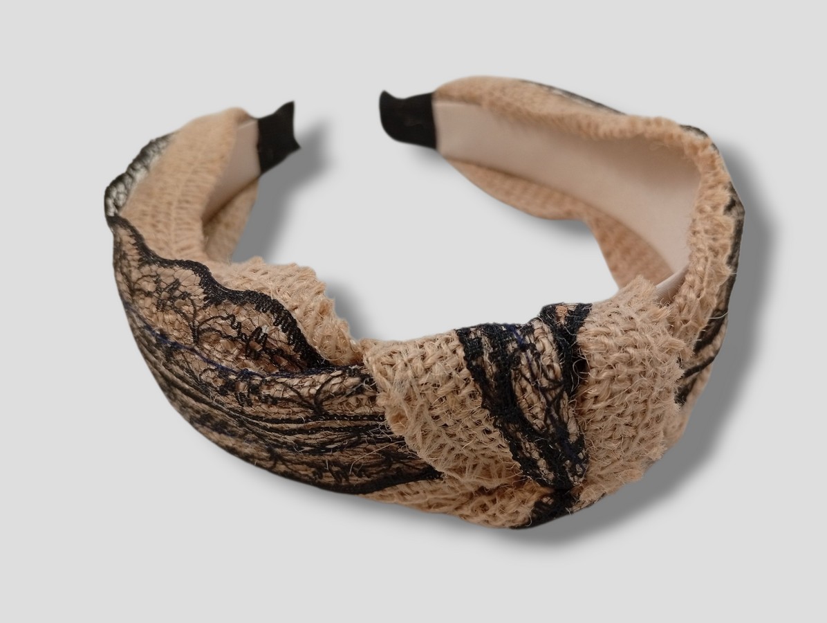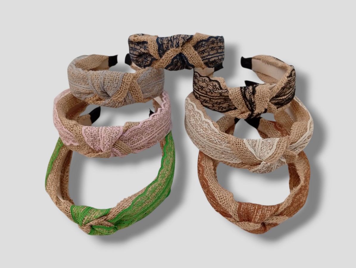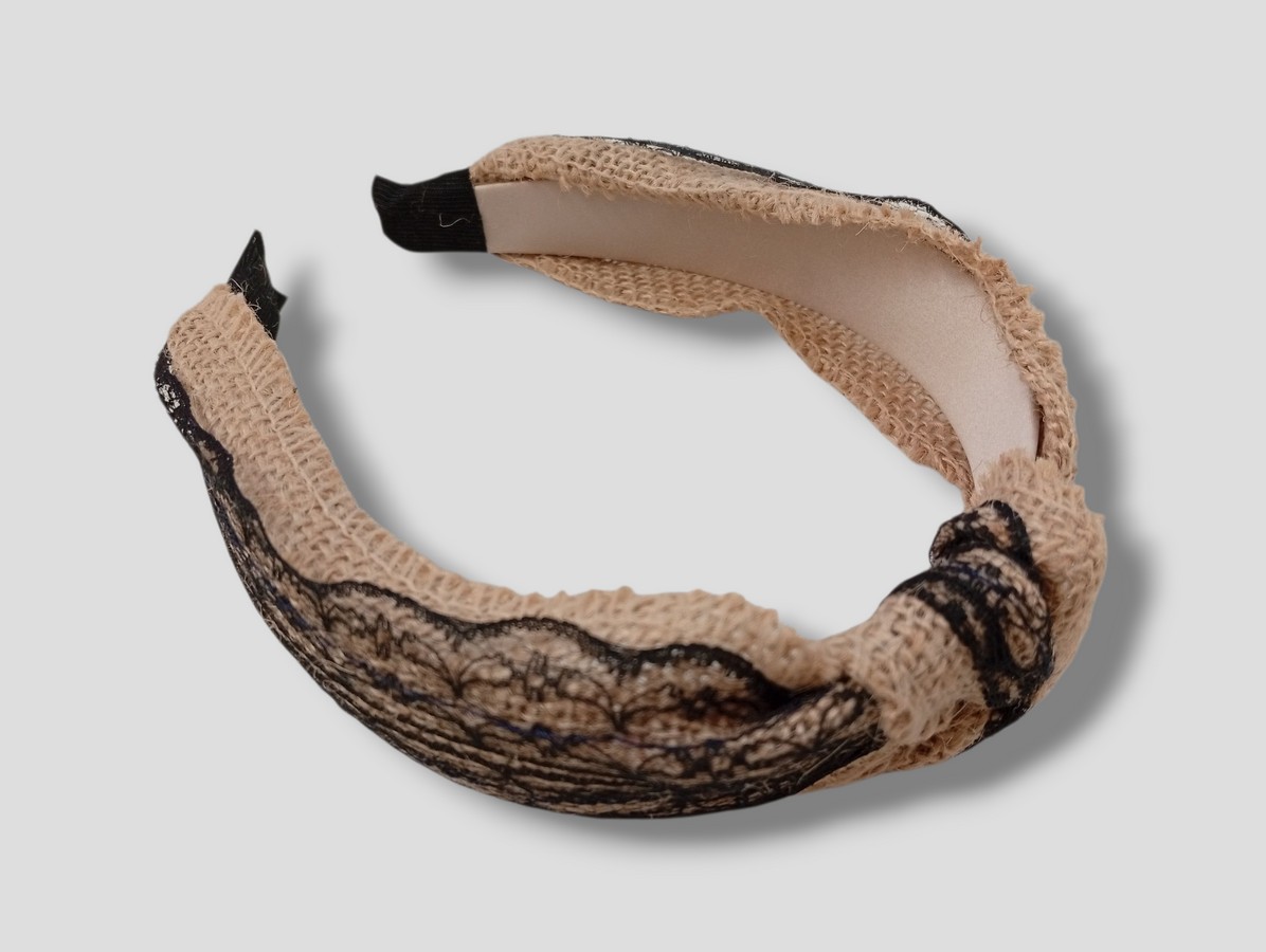 Diadema. De tela de arpillera con encaje. Cuerpo de plástico forrado.