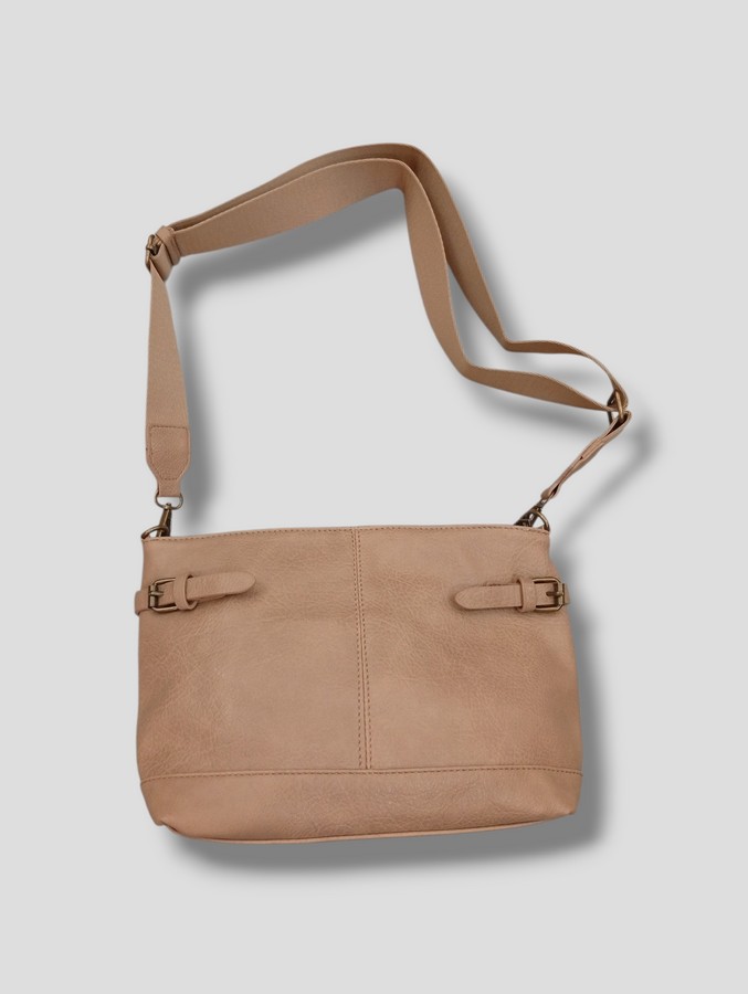 Bolso bandolera. Con cierre de cremallera. Correa regulable para llevar cruzado. Forrado. Con varios departamentos. Detalle de hebillas.