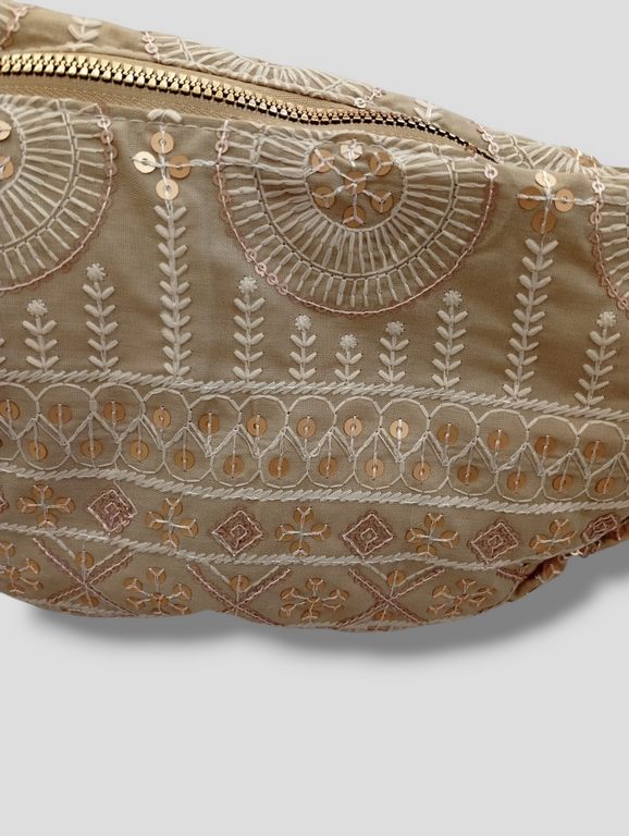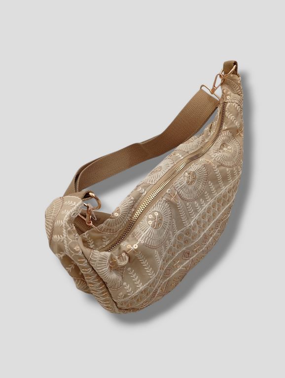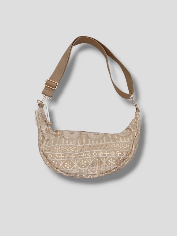 Bolso. En forma de media luna. Con cierre de cremallera. Forrado y con departamento interior. Detalle de bordados y lentejuelas. Correa regulable con cierre de mosquetón.
