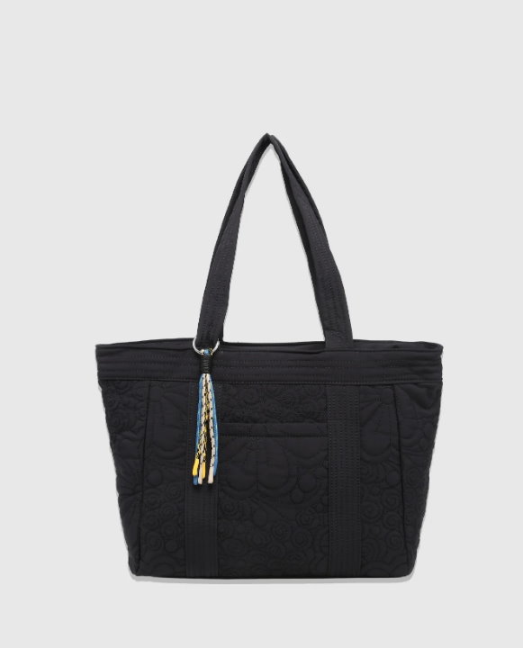Bolso tipo shopper. Forrado. Con cierre de cremallera. Bolsillos interiores. Correa para llevar al hombro. Detalle de borla y pespuntes. Con compartimentos en el exterior.
