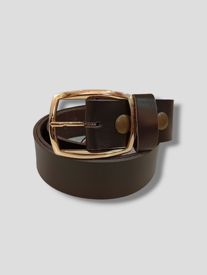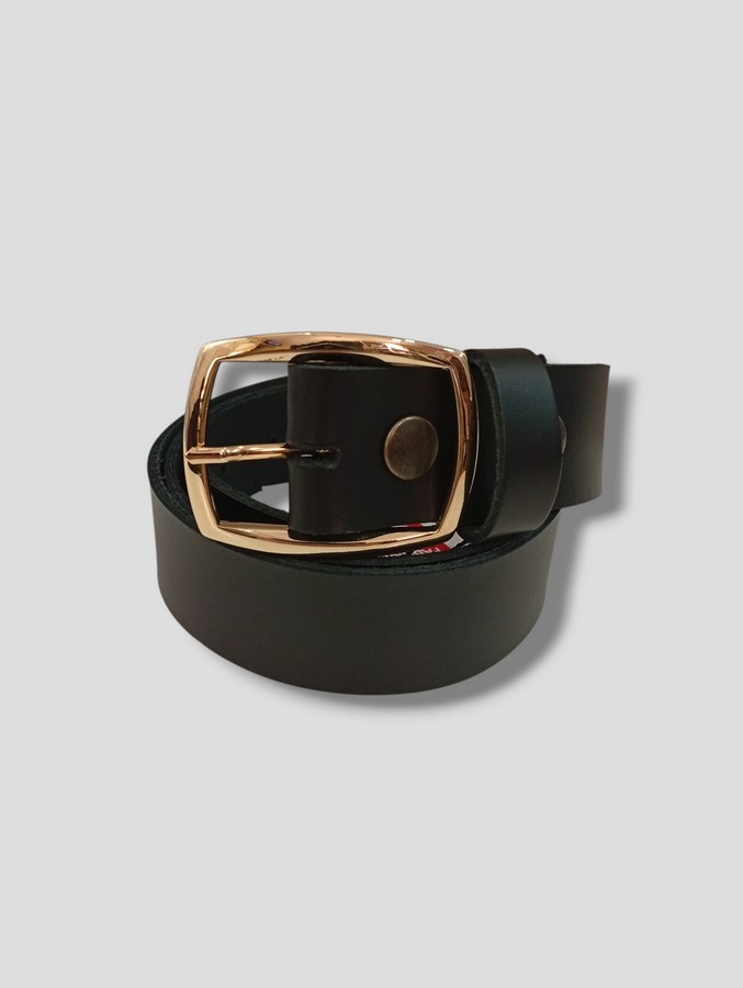 Cinturón de piel. En color negro y marrón oscuro. Con hebilla dorada. Tira de piel especial para intercambiar hebillas.