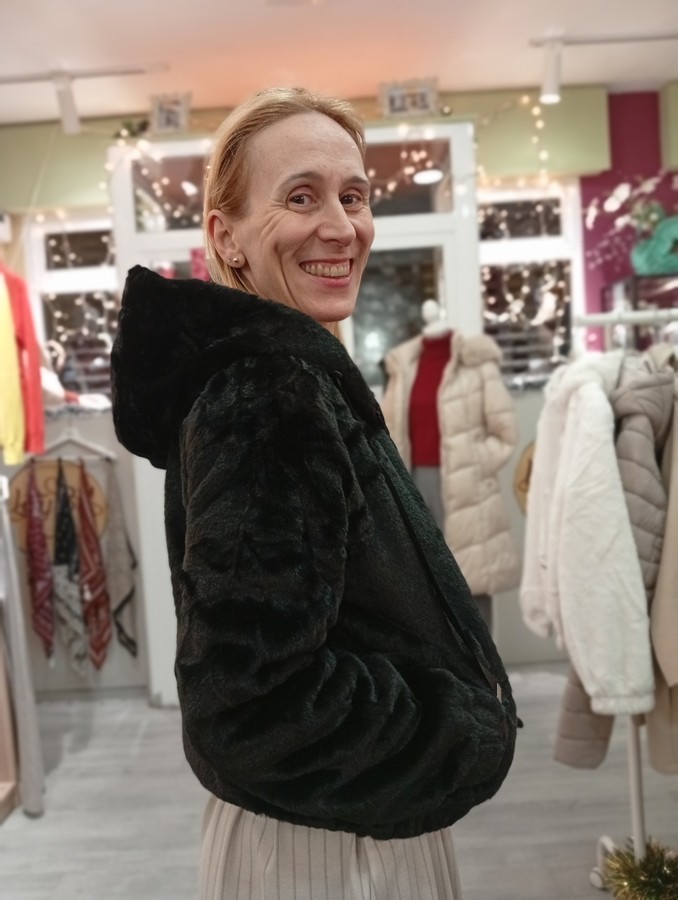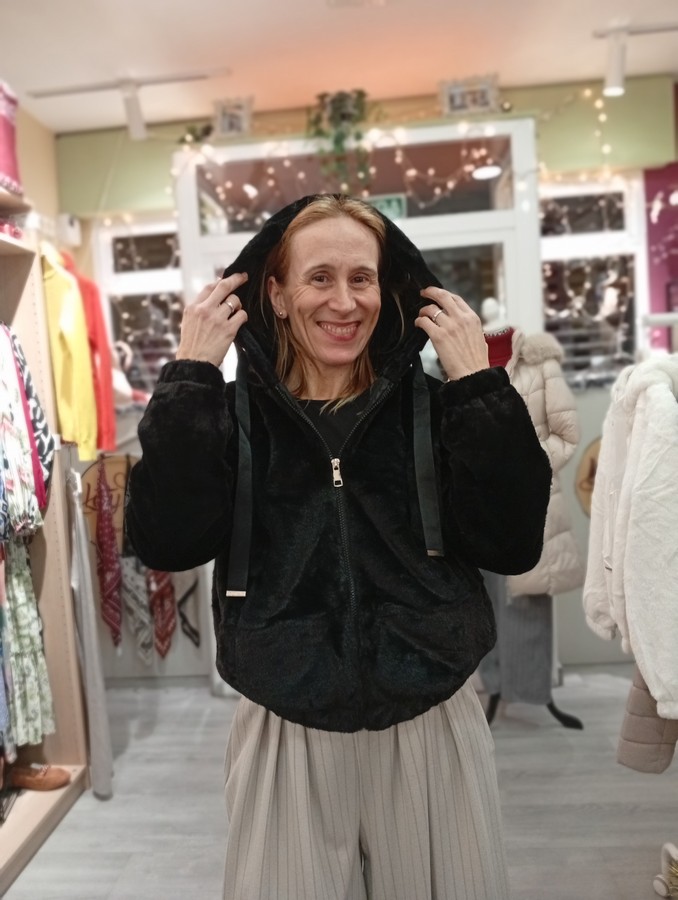 Chaqueta de pelo. Forrada. Con capucha. Cierre central de cremallera. Bolsillos laterales. Goma en los puños y el bajo. En varios colores.