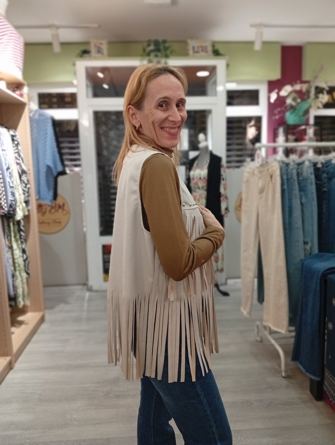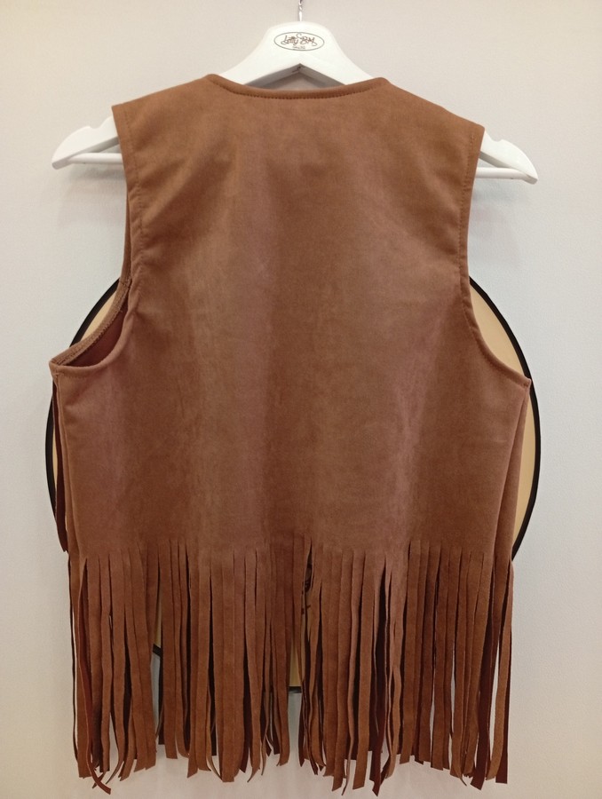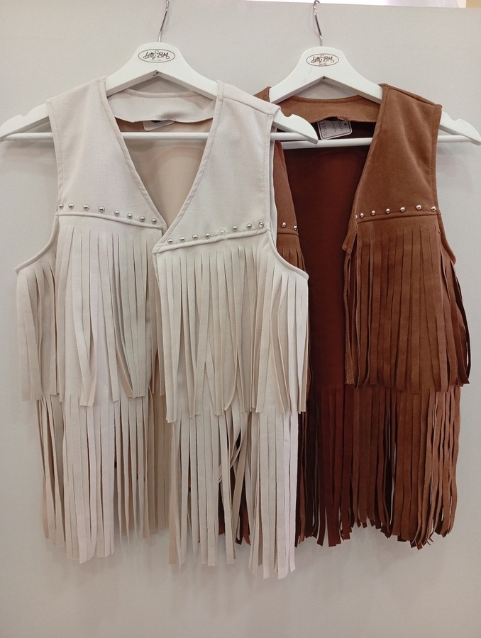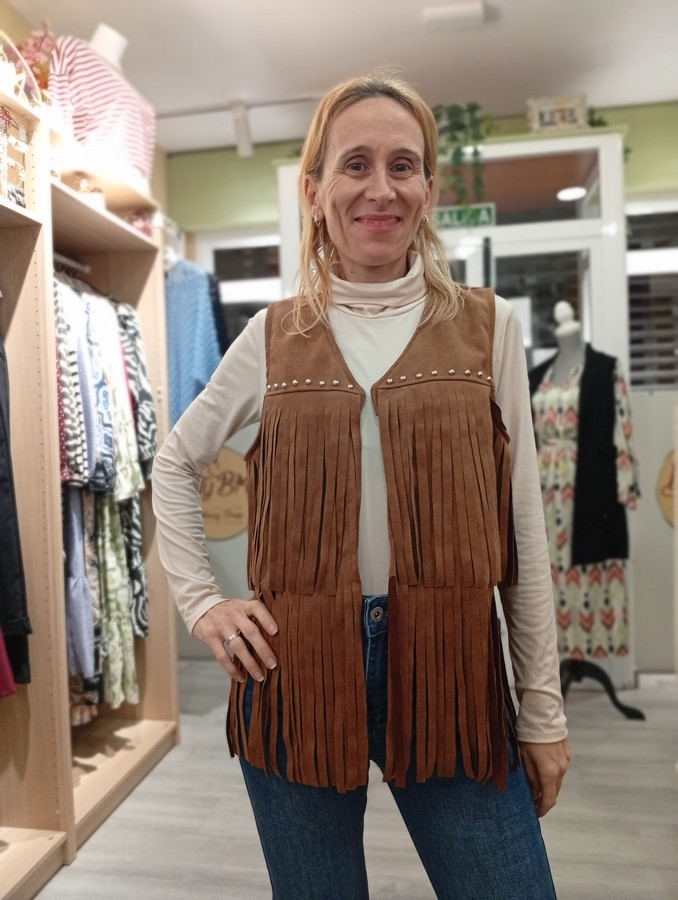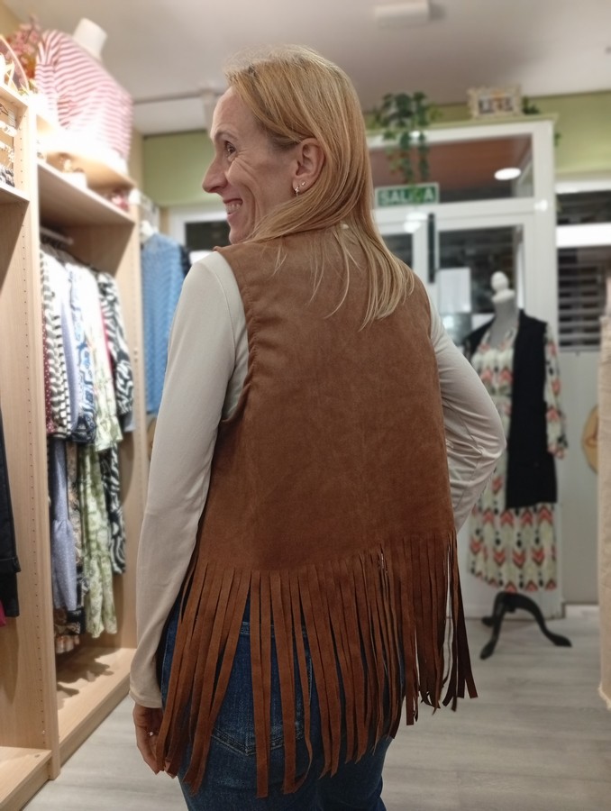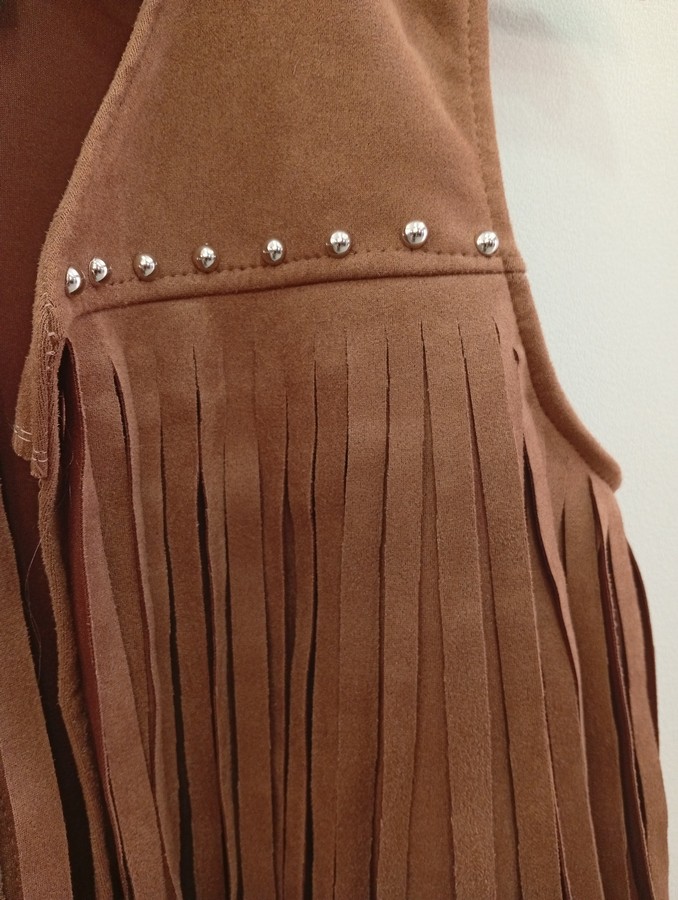 Chaleco antelina. Con flecos. Escote en pico. Detalle de tachuelas en el pecho. En varios colores.
