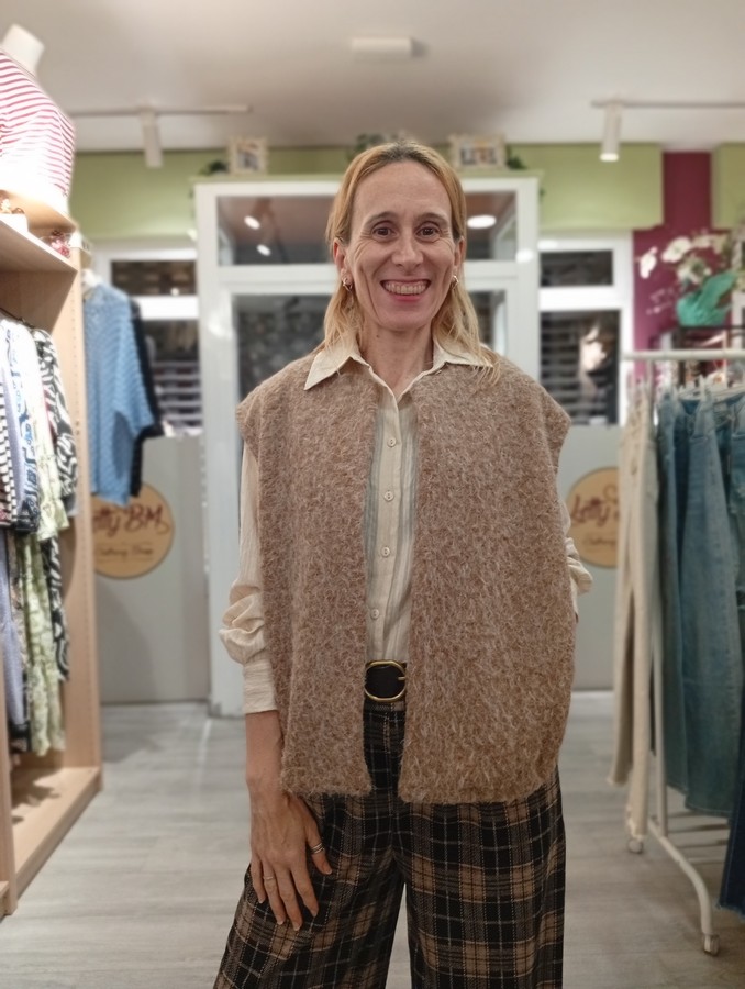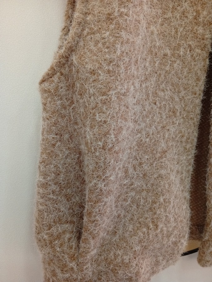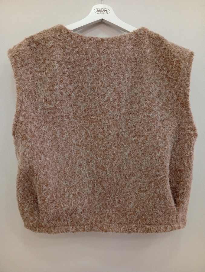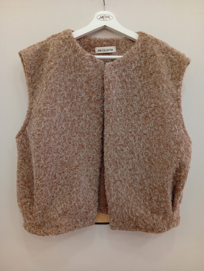 Chaleco corto. En tejido con pelito. Corte suelto. Escote redondo. Con bolsillos. Pinzas en los laterales.