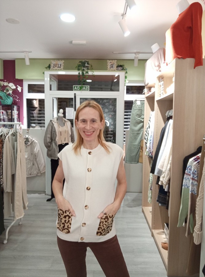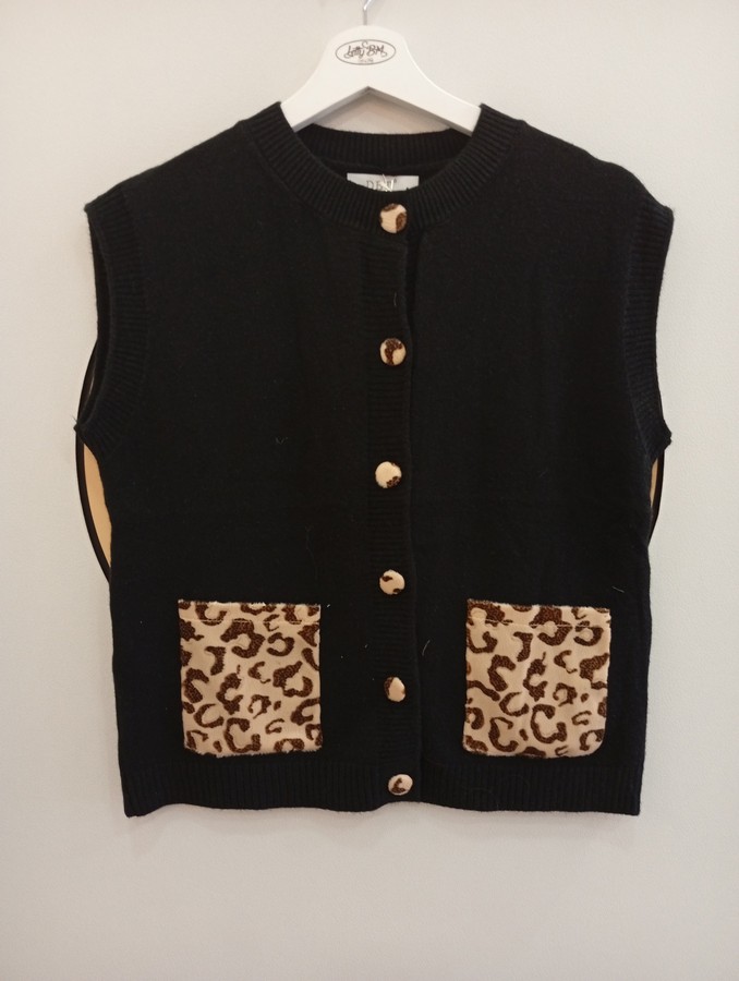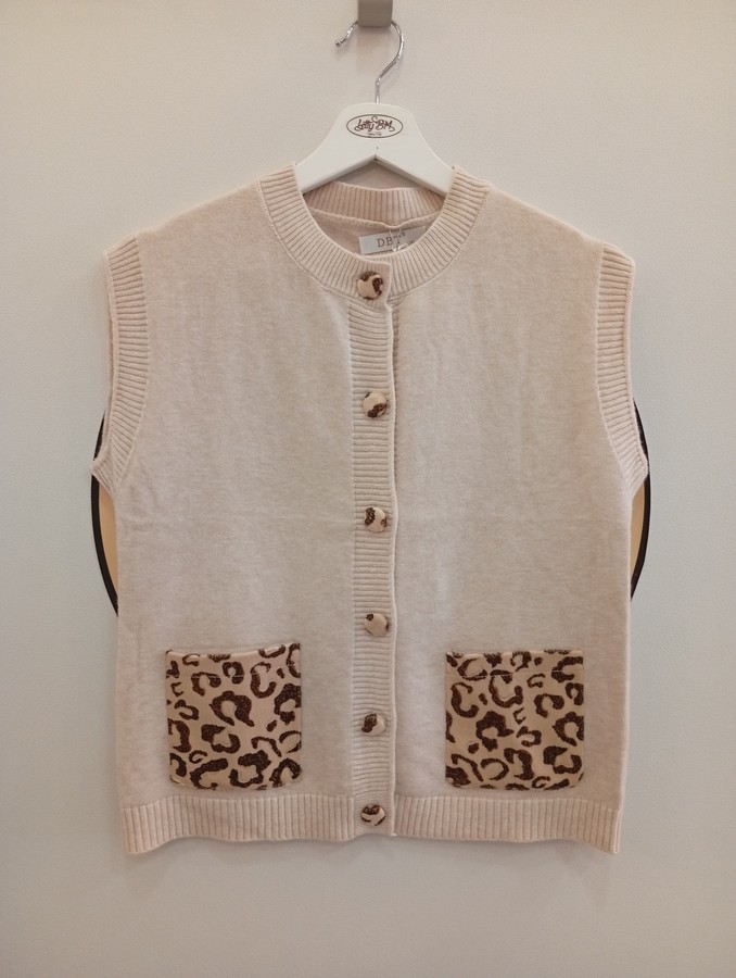 Chaleco de punto. Con cierre central de botones. Escote redondo. Bolsillos de plaston en estampado print a juego con los botones. En varios colores.