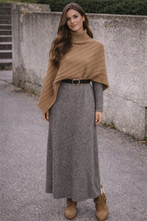 Poncho de punto. Con cuello cisne. Dibujo acanalado. Corte asimétrico.
