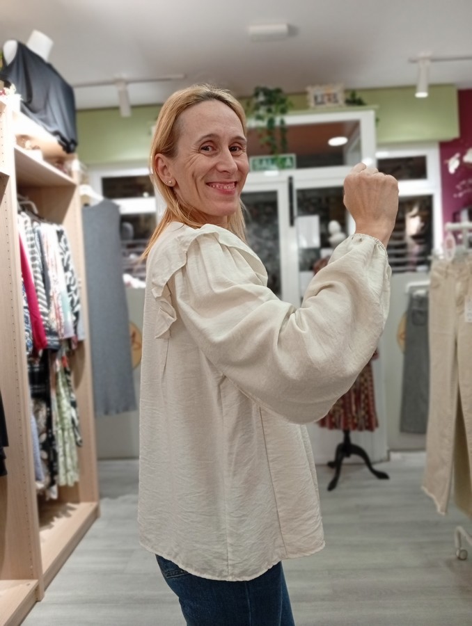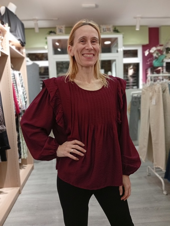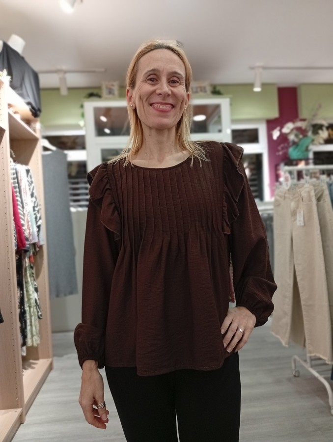 Blusa. Con pespuntes en el pecho imitando plisado. Corte suelto. Manga larga abullonada con goma en el puño. Escote redondo. Cierre de botón en el cuello con pequeña abertura en lágrima. En varios colores.