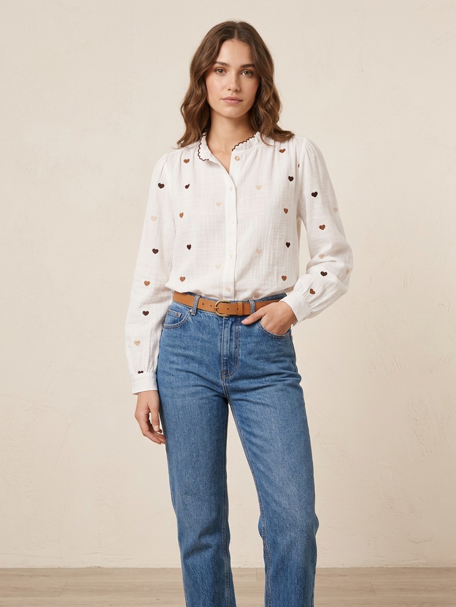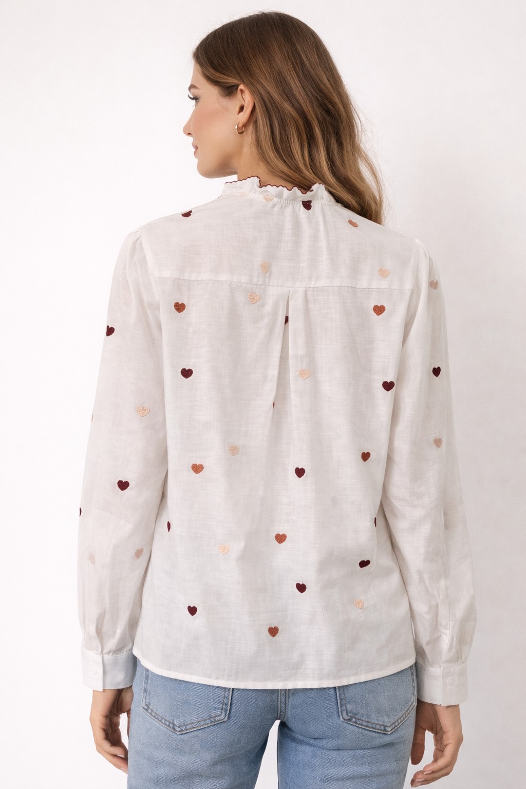 Camisa de algodón. Con corazones bordados en toda la camisa y las mangas. Manga abullonada en el hombro. Tejido semitransparente. Cuello mao con detalle de ondas bordadas. Espalda con canesú y pinza.
