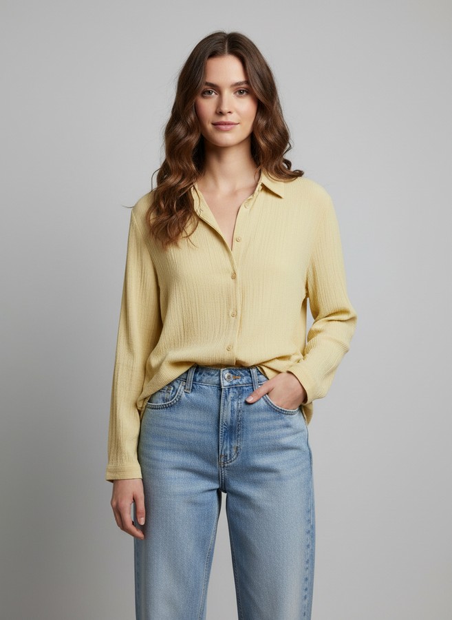 Camisa color pistacho. Bajo asimétrico, redondeado. Detalle original de abertura en la espalda. Tela con efecto arrugado.