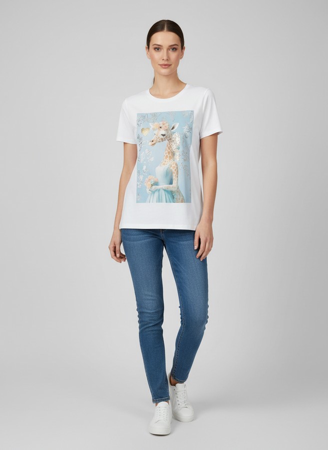 Camiseta de algodón. De manga corta. Escote redondo. Con dibujo central de jirafa con detalles dorados.