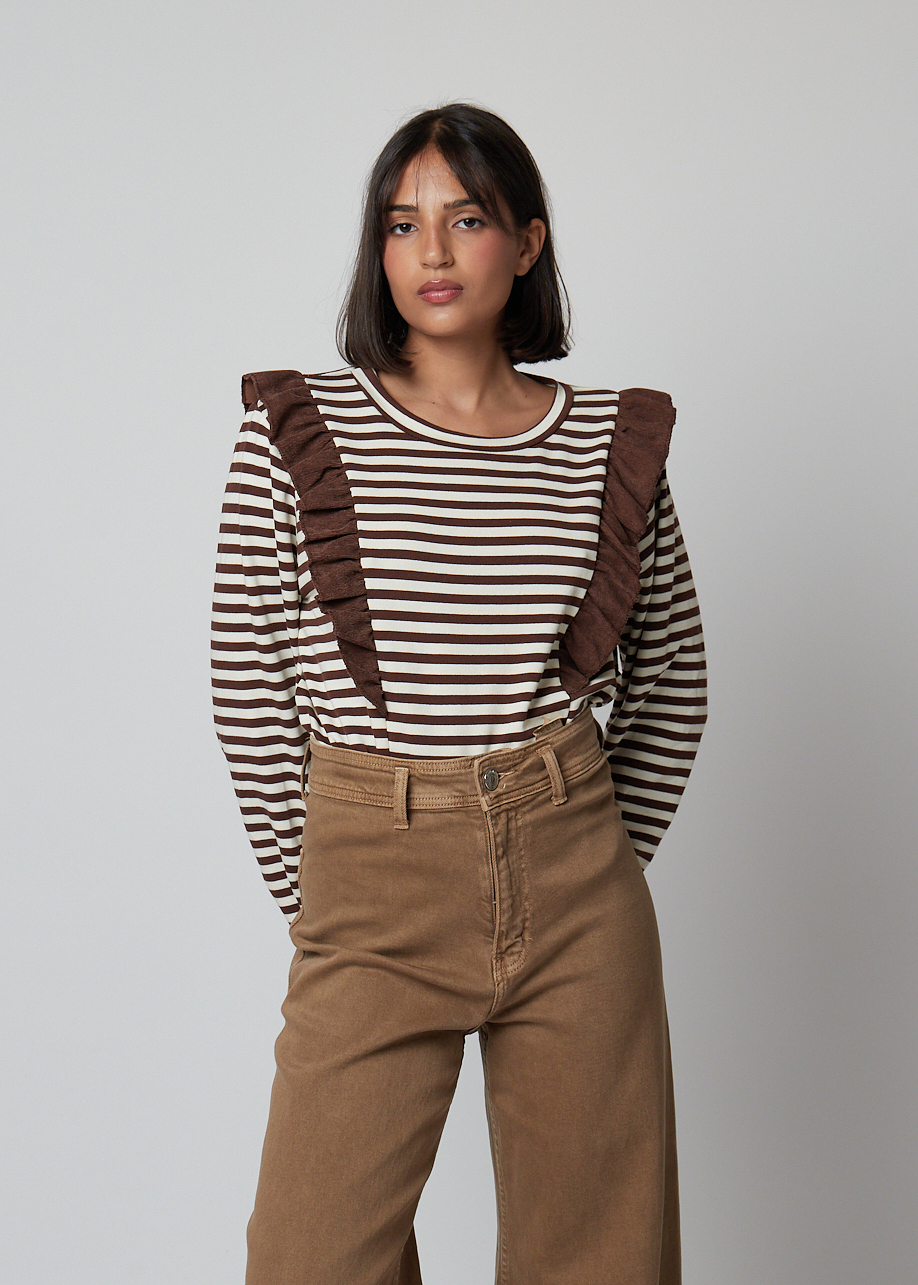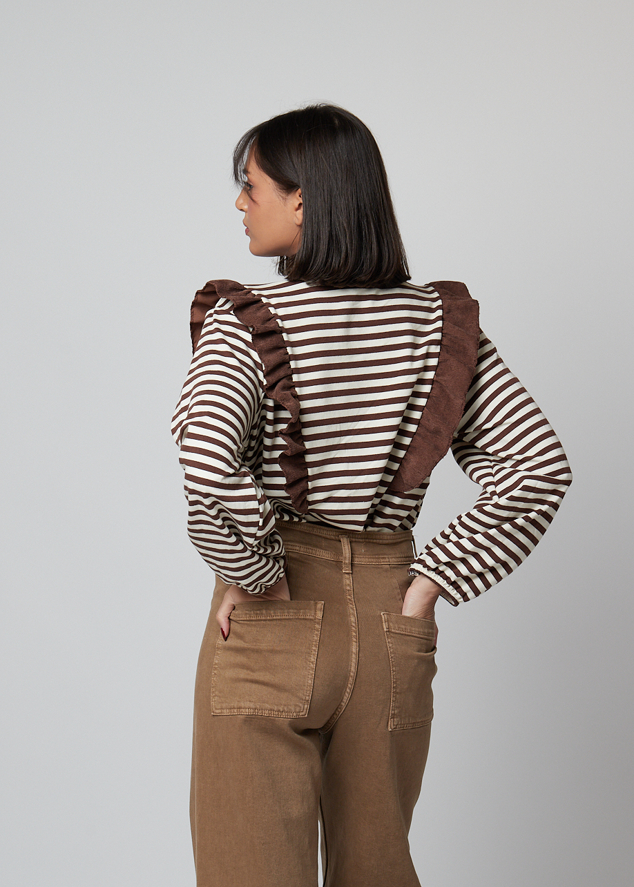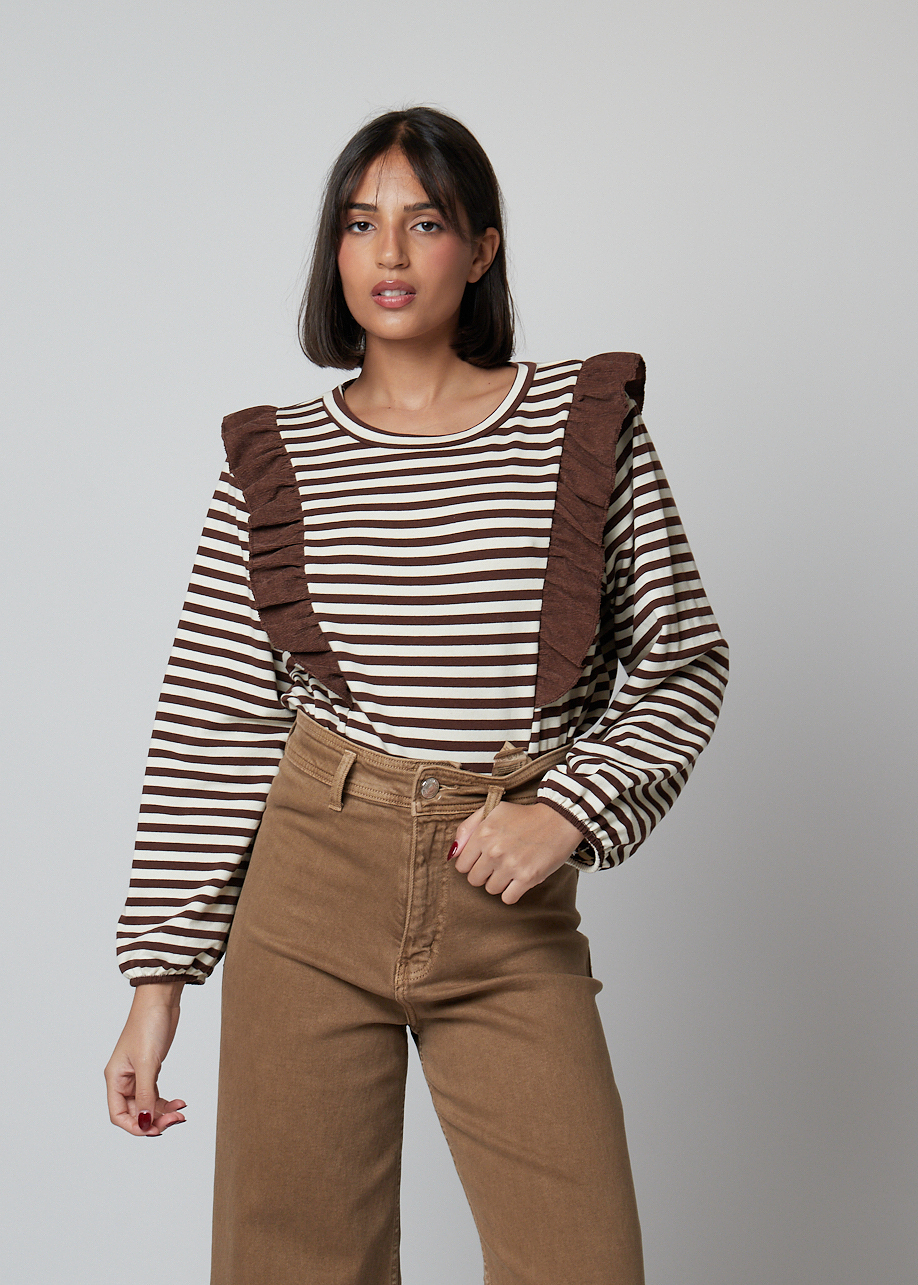 Camiseta con estampado de rayas. Detalle de volante de micro pana. Escote redondo. Manga abullonada con goma en el puño. Corte suelto.