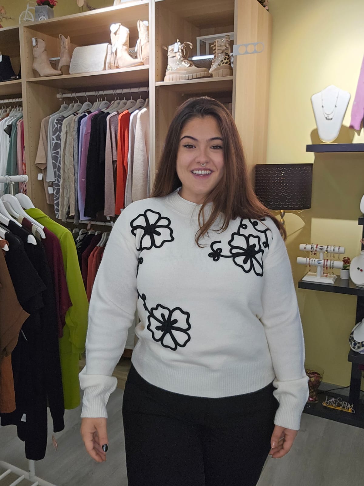 Jersey de punto. De escote redondo. Manga larga caída. Detalle de cordón con forma de flores. En varios colores.
