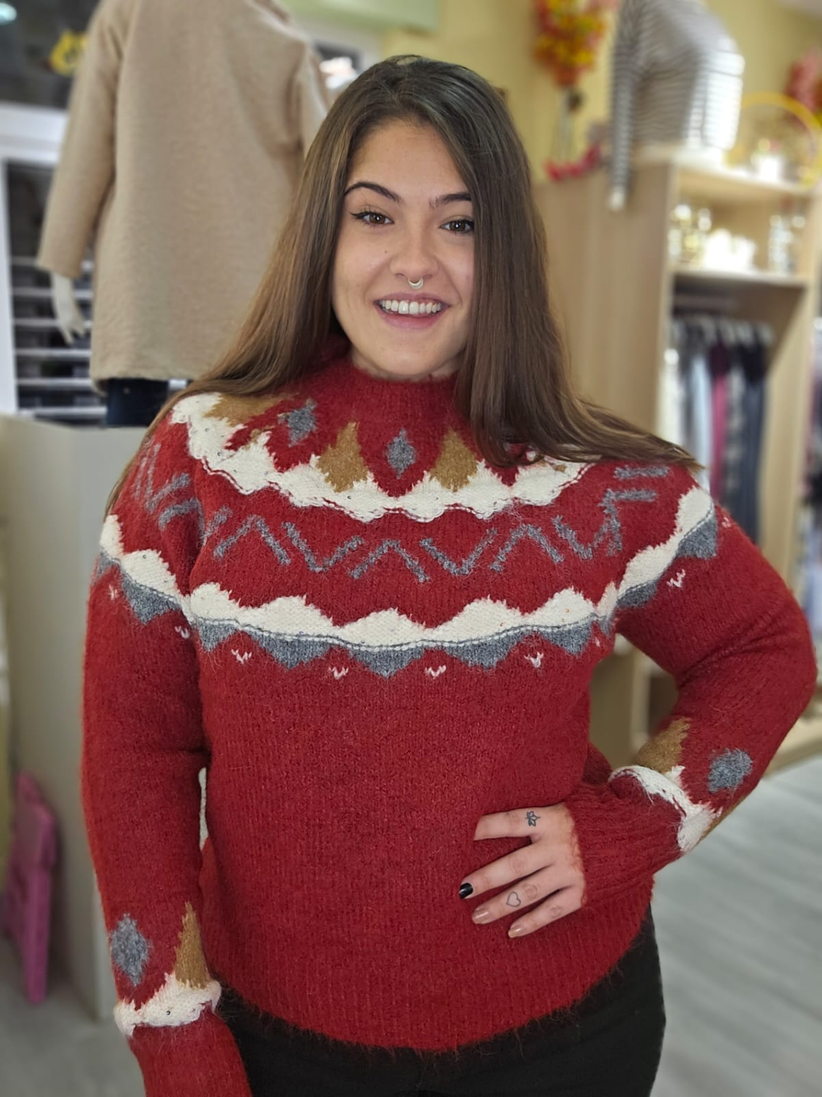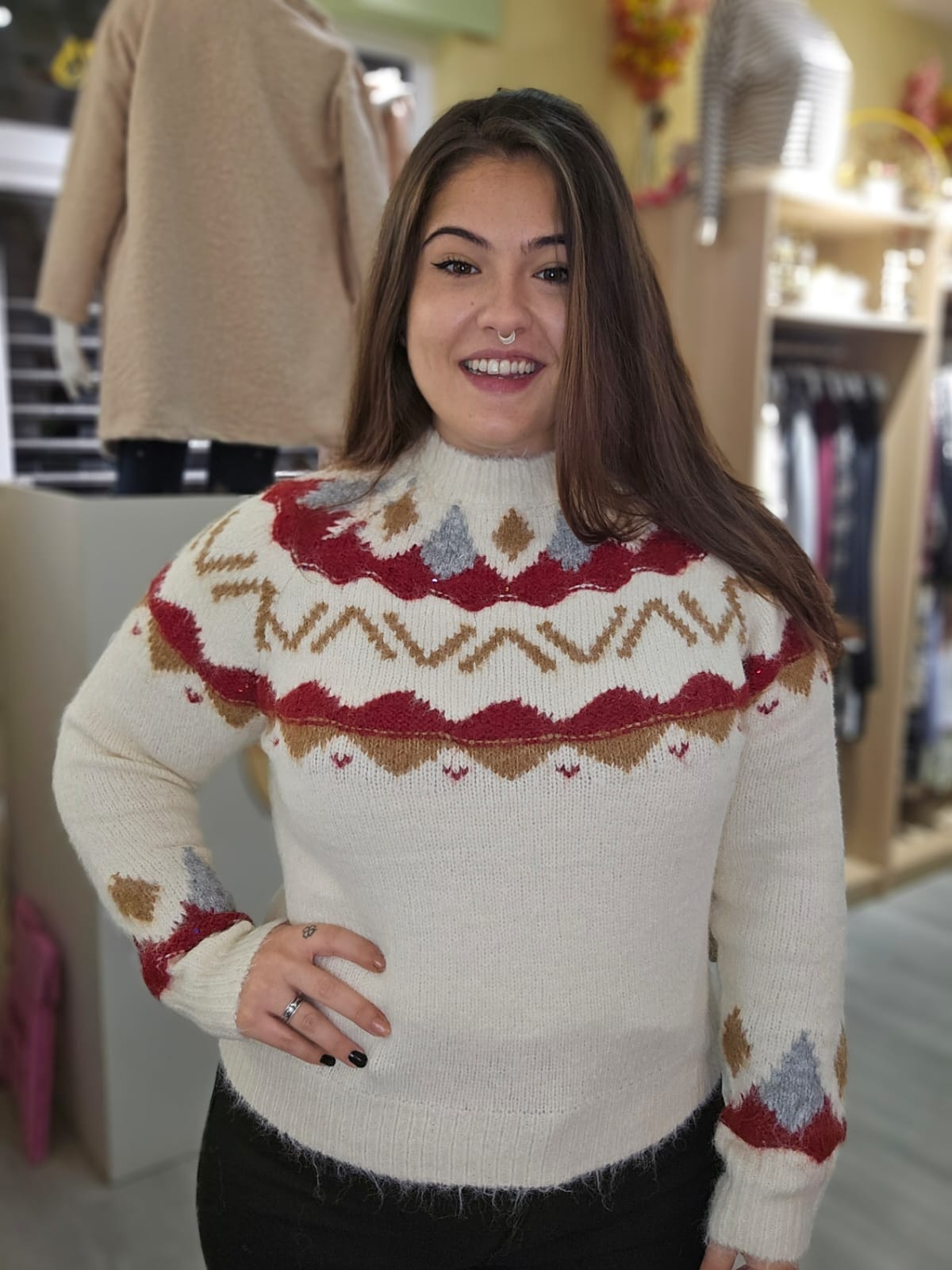 Jersey de punto. Con estampado de grecas. Escote redondo. Manga caída. Con detalle de lentejuelas. En varios colores*.