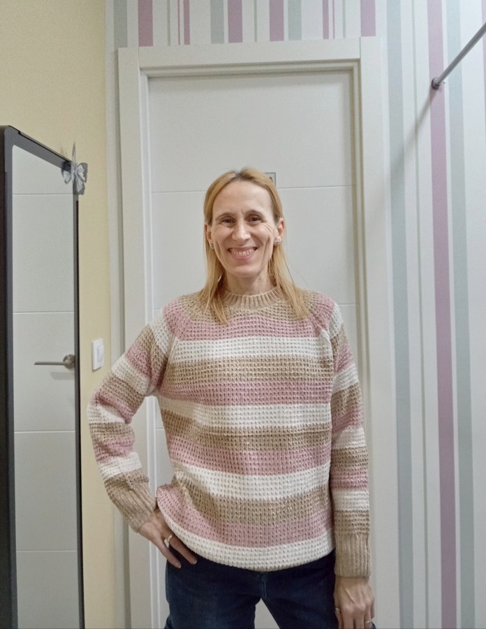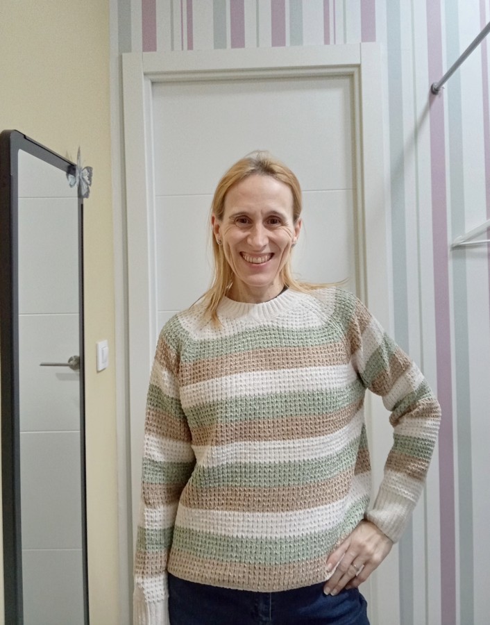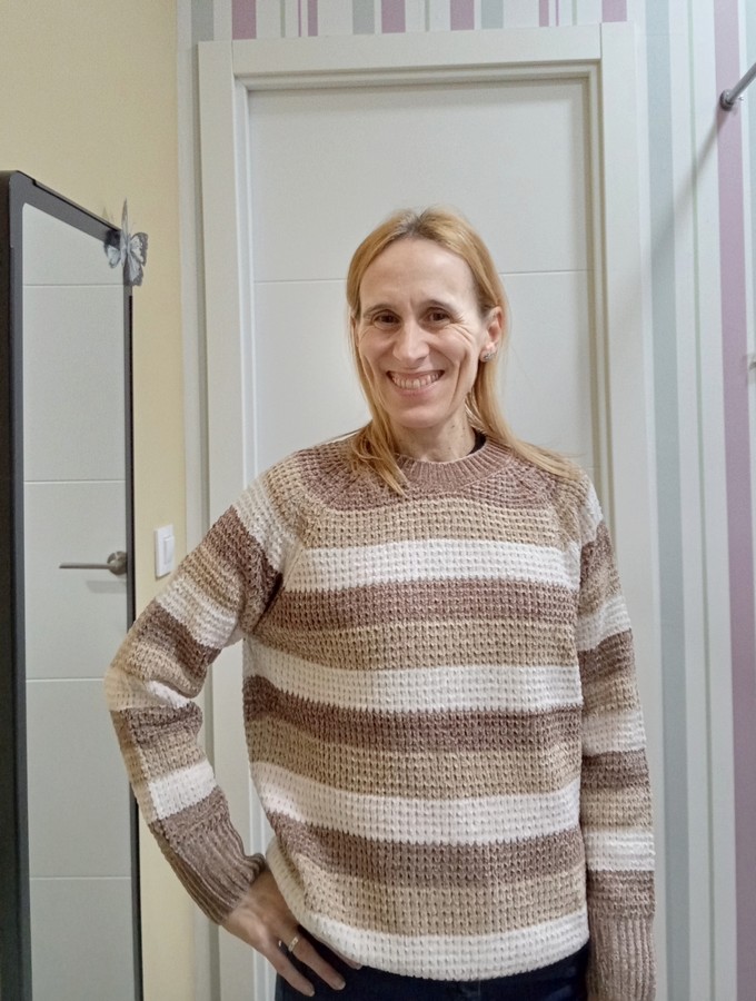 Jersey de punto. Tipo aterciopelado. Con escote redondo. Estampado a rayas de colores. Manga ranglan. En varios colores.