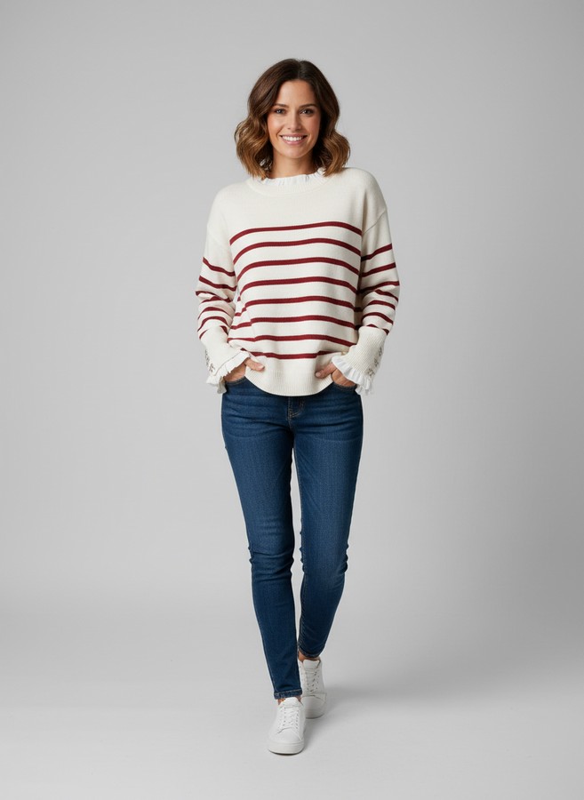 Jersey de punto. En tono crudo con rayas granates. Con detalle en cuello y puños, de tejido imitando llevar una blusa por debajo. Escote redondo. Manga caída. Puño ancho con falsos botones en forma de lazo.