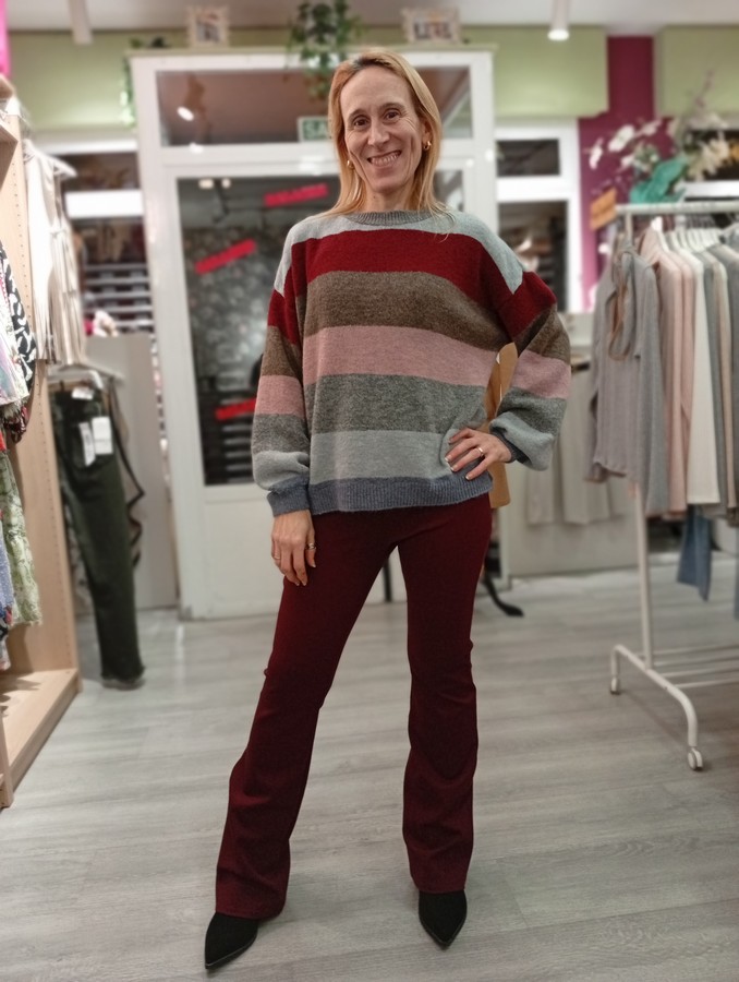 Jersey de punto. Con estampado a rayas. Escote redondo. Manga caída abullonada en el puño.