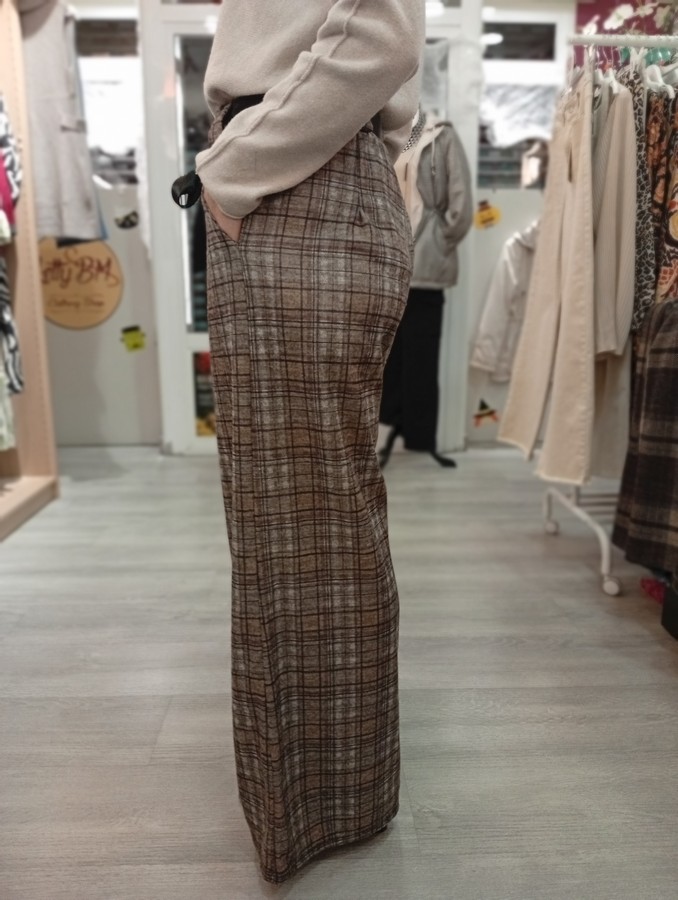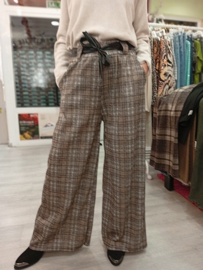 Pantalón de cuadros. Elásticos. Con goma en la cintura. Tiro alto. Bolsillos laterales. Trabillas con lazo.