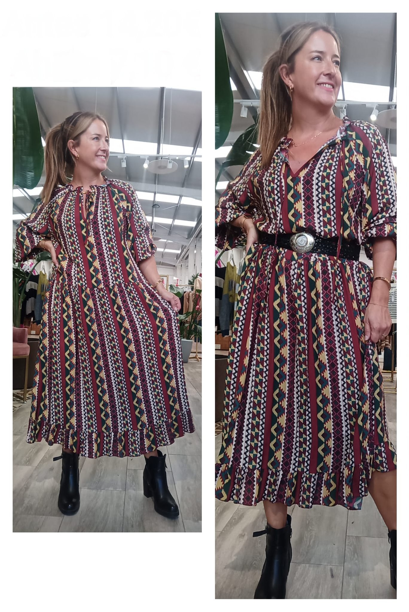 Vestido* largo. Con estampado étnico. Escote redondo festoneado, elástico, con cordón y pequeña abertura. Manga larga ranglan con goma en el puño. Volante en el bajo. Corte en el talle.