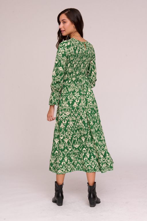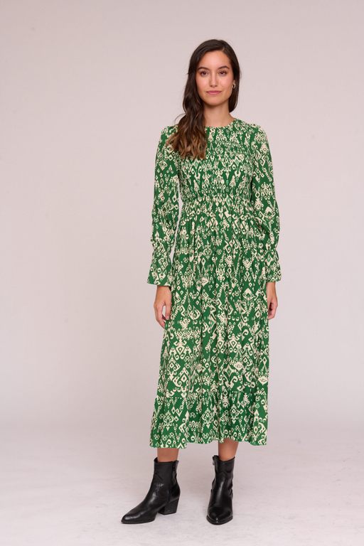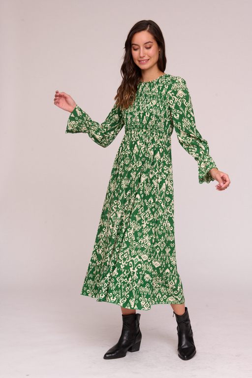 Vestido midi. En colro verde con original estampado en crudo. Manga larga abullonada con elástico en el puño. Escote redondo. Volante en el bajo. Cuerpo con nido de abeja. Cierre de botón en la nuca con abertura en lágrima.